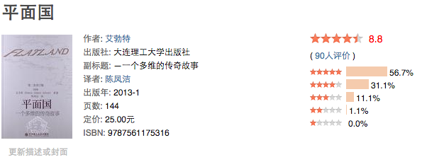 当诺兰脑洞大开到了五维空间,艾勃特却固执地倒退到二维世界,在他的平面国里,一切都是平面的:国土是平面的,山川河流是平面的,连人也是平面的——最贫穷卑微的是等腰三角形,最高贵的是圆形,最让人害怕的是直线。不知道当平面国遭遇五维世界,会有怎样一番争论呢?