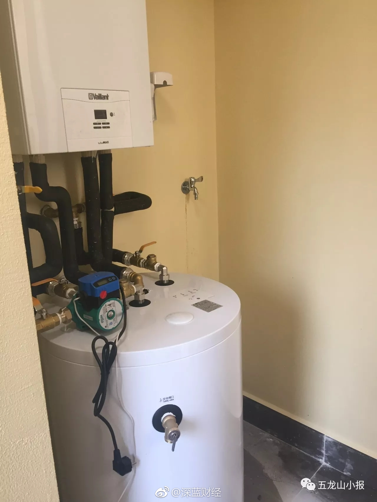 比如115户型的生活阳台,你完全不知道业主未来如何安放洗衣机。一个硕大的地暖热水器占据了一半的空间,而且热水器居然没有贴着墙壁安装,业主们想来想去都不知怎么放洗衣机了。