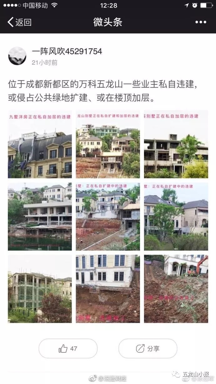 当我们有一天再次来到五龙山公园的湖泊边,发现曾经买房时看到的秀美的湖景已经被那些买湖边别墅的土豪乱搭乱建,破坏绿地,竟然修起了一栋又一栋像农家乐一样的房子。