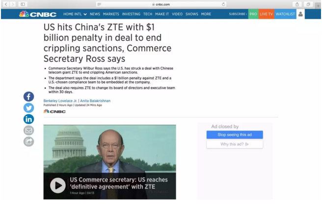 美国商务部长威尔伯•罗斯(Wilbur Ross)周四告诉CNBC,美国与中兴达成了协议,终止美国制裁令。