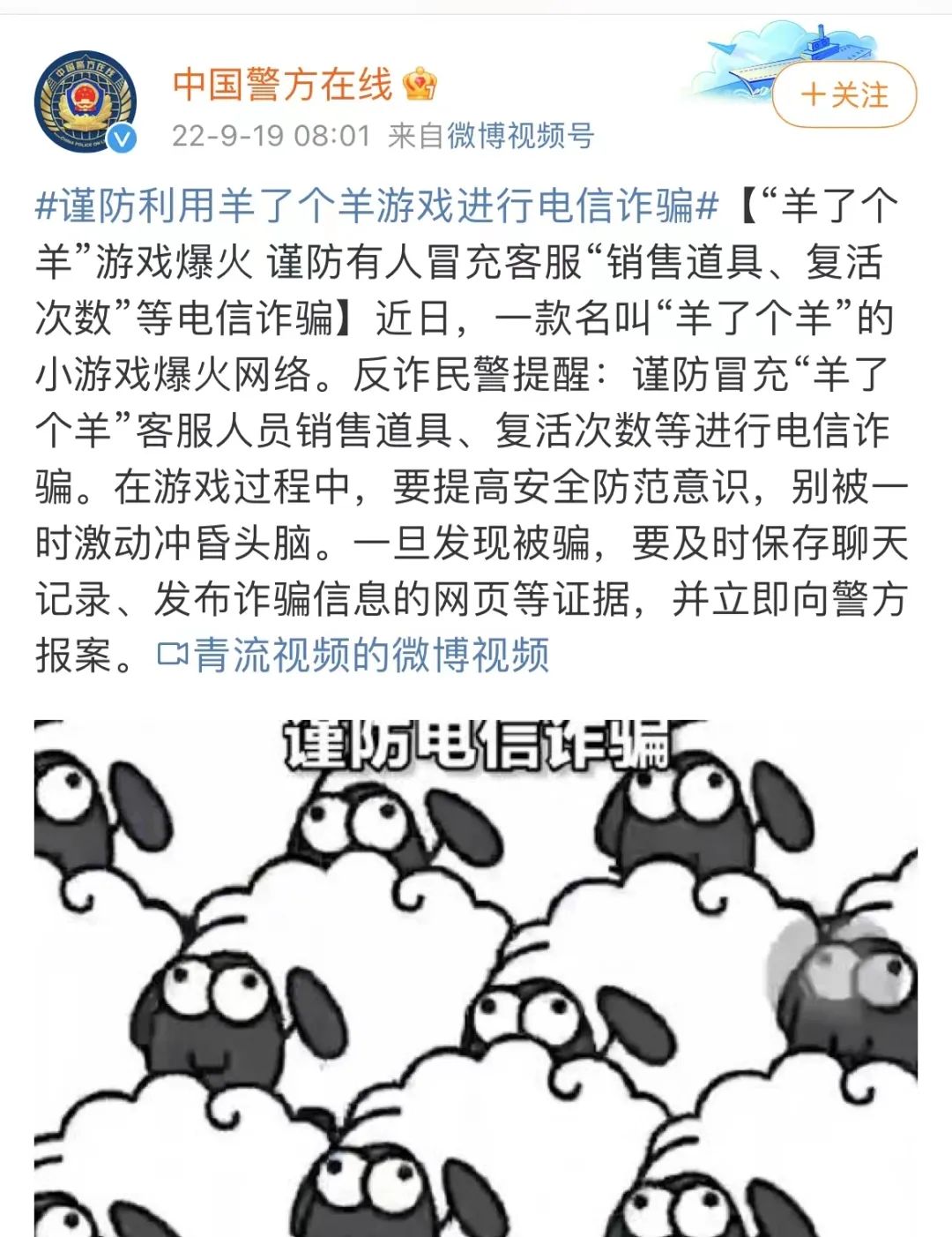 中国公安部治安管理局在其官方社交平台上发文称,谨防有不法分子冒充“羊了个羊”客服人员销售道具、复活次数等进行电信诈骗,提醒用户在游戏过程中提高安全防范意识。