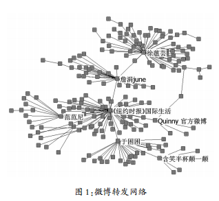 在这个案例中,用户推荐主要来自机构账号、职业记者或编辑账号、明星账号和少量普通账号。“Quinny官方微博”属于商业机构的账号,Quinny是一个童车品牌,其新浪微博账号拥有118465位粉丝,在本案例中直接和间接带动5%的用户转发;“于困困”和“詹涓june”均为《纽约时报》中文网编辑,属于职业编辑账号,二人微博共有79644位粉丝,在本案例中直接或间接带动65%的用户转发;“徐蕴云”为临床医学博士,亦在媒体任职(《时尚健康Men’s Health》编辑),属于明星账号和职业编辑账号,拥有177282位粉丝,在本案例中直接和间接带动47%的用户转发;“范范尼”属于普通账号,拥有25723位粉丝,直接和间接带动5%的用户转发。本文使用社交网络分析软件UCINET6.0对这条微博的转发关系进行了可视化处理,从图1中可以看到,在这条微博的转发关系网络中,主要节点是《纽约时报》中文网编辑于困困、詹涓june和《时尚健康Men’sHealth》编辑徐蕴芸,他们推动了该微博的二级和多级传播。普通用户拥有的粉丝较少,不能像机构账号、职业记者或编辑账号和明星账号那样带动大量转发,但是他们数量众多,在很多情况下也会在各自的关系网络中进行再次传播,其扩散新闻的作用同样不容小觑。