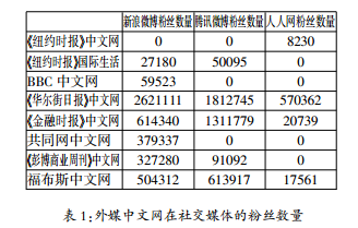 上文提到的8个外媒中文网,都在中国主要的社交媒体创建了账号。几乎所有外媒中文网都在新浪微博建立了账号,而在社交网站(人人网)建立账号的外媒较少;同时在微博和社交网站建立账号的外媒中,微博粉丝数量多于社交网站粉丝数量;《华尔街日报》中文网在社交媒体的粉丝数量排在首位,《纽约时报》中文网和《纽约时报》国际生活在社交媒体的粉丝数量较少,但是考虑到国内用户目前无法正常访问这两个网站,这一数字仍谓可观,也说明社交媒体发挥了替代和补充新闻网站的作用。(见表1)