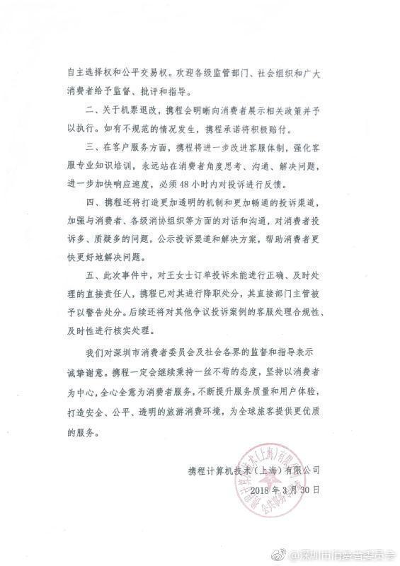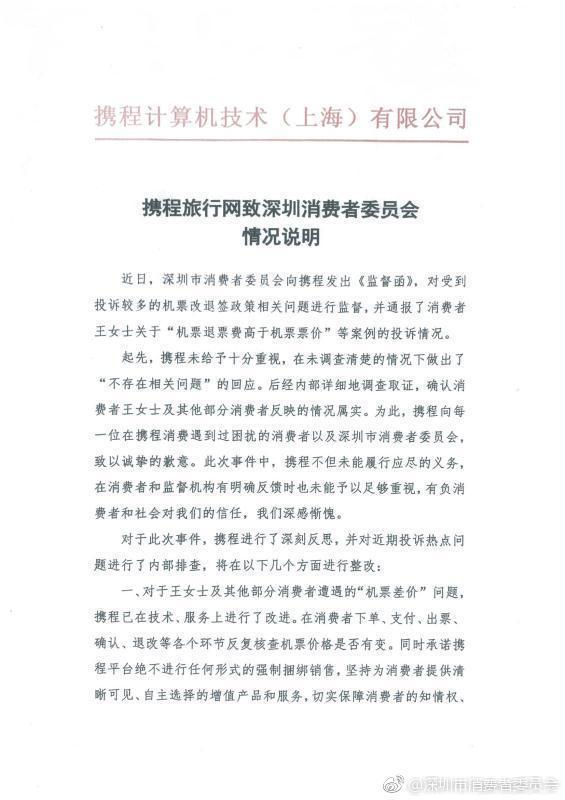 携程向消费者道歉并提出五条整改措施,深圳消委会表达三点意见: