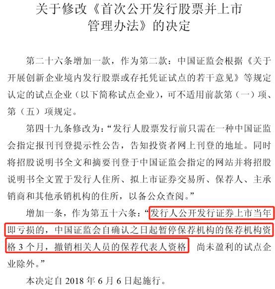 6月6日深夜,证监会发布了《存托凭证发行与交易管理办法(试行)》等与CDR有关的9个文件。其中《首次公开发行股票并上市管理办法》、《首次公开发行股票并创业板上市管理办法》都加了一条保荐人的“夺命条款”:“发行人公开发行证券上市当年即亏损的,中国证监会自确认之日起暂停保荐机构的保荐机构资格3个月,撤销相关人员的保荐代表人资格,尚未盈利的试点企业除外“。